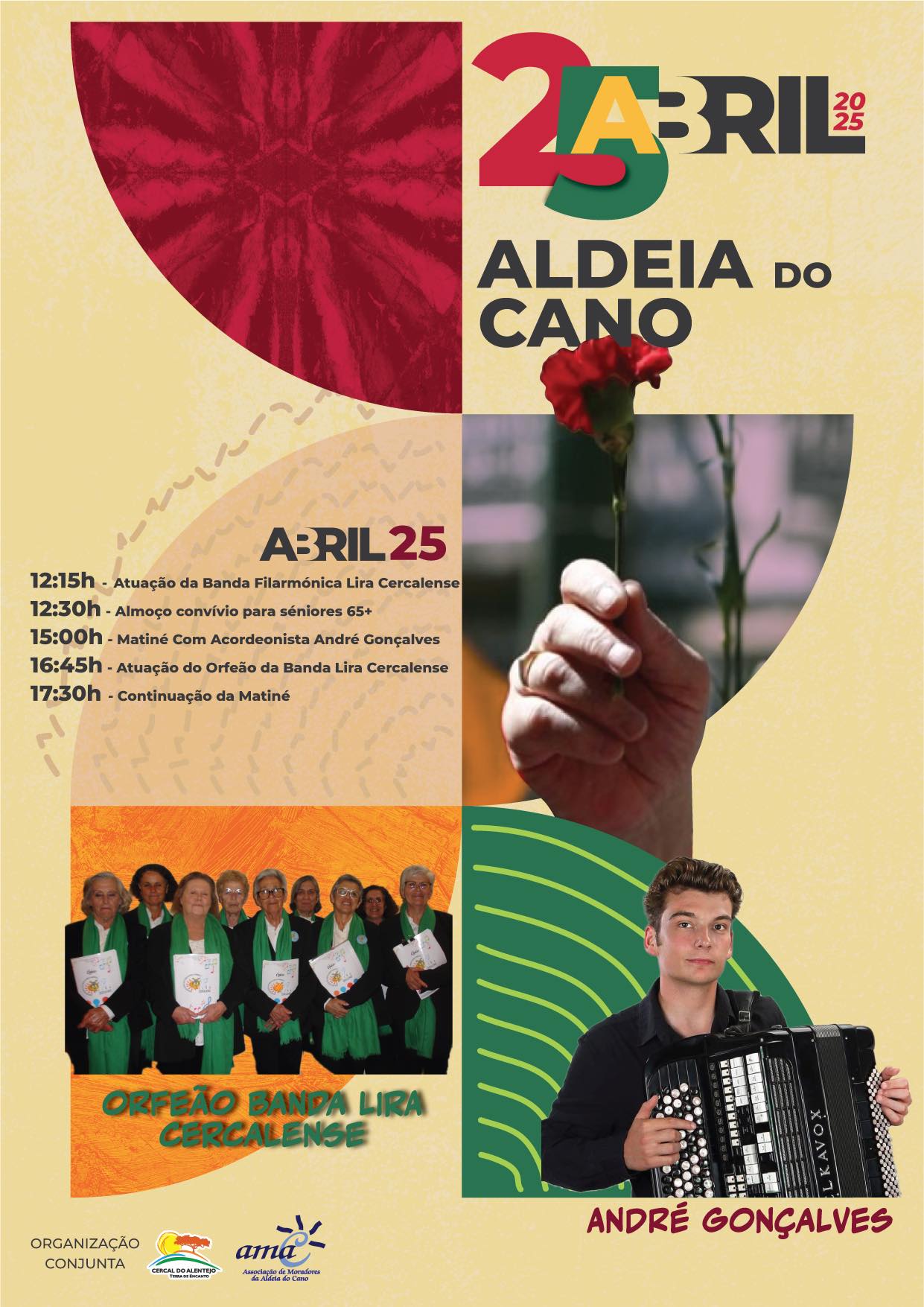 No dia 25, teremos um dia cheio de momentos desde o hastear das Bandeiras, a presença da Banda Lira nos diversos lugares da Freguesia, diversas actividades para meninos e meninas no Largo dos Caeiros, programa cultural no Cercal do Alentejo que começa à tarde e termina noite adentro e na Aldeia do Cano que começa na hora de almoço e termina no final da tarde!