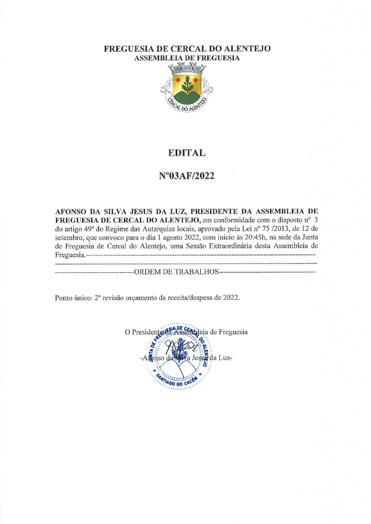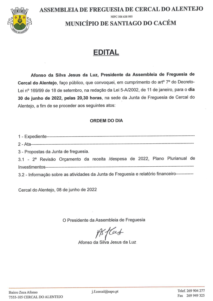 Assembleia de Freguesia - 30/06/2022 às 20h30