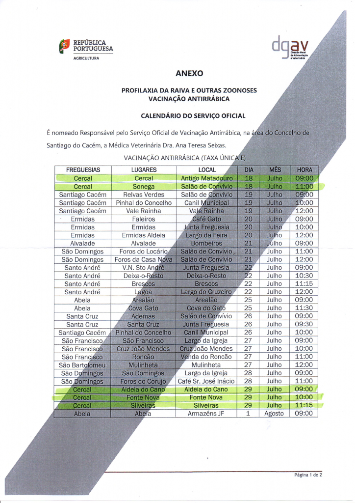Calendário do Serviço Oficial - Vacinação Antirrábica 2022